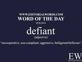 Today’s “Word of the Day” is defiant and it is a adjective meaning “uncooperative, non-compliant; aggressive, belligerent/bellicose”. This word is present […….]